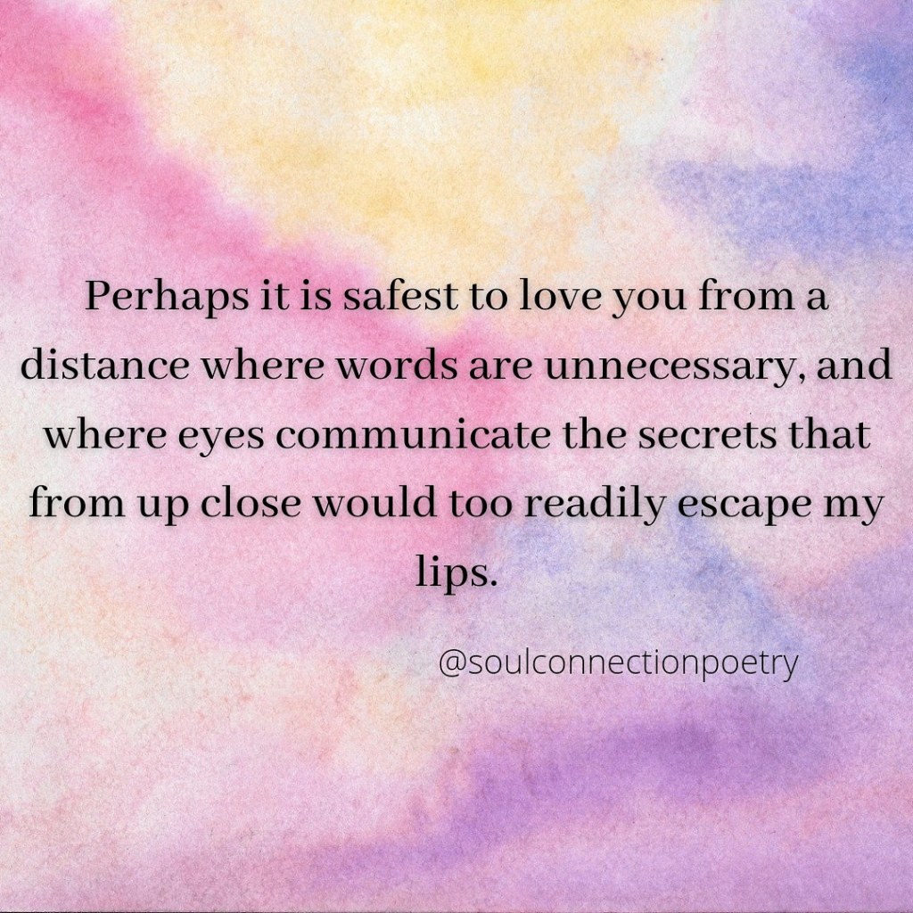 To love from a distance. Posted byElizaMay 30, 2021Posted inUncategorizedTags:Connections, Falling in love, Fear, Feelings, Longing, Love, Musings, Poetry, Quote, Reflections, Relationships, Romance Share this: Share on X (Opens in new window) X Share on Facebook (Opens in new window) Facebook Like Loading... Related Published by Eliza Writing helps me find myself. View more posts